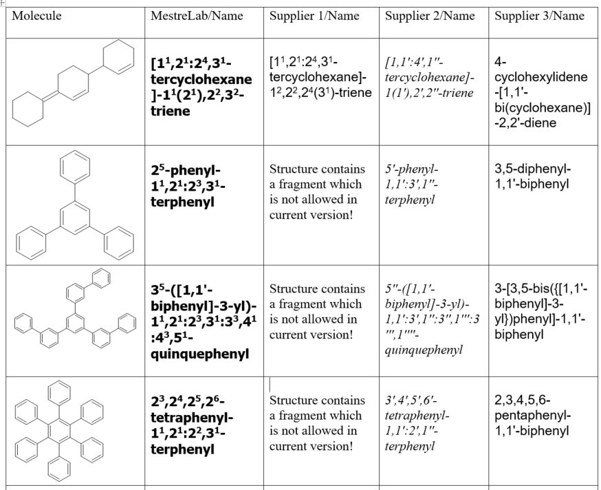 The table below contains names of several assemblies generated by MestreLab/Name, and the other 3 applications. The correct IUPAC names are bolded, acceptable names highlighted with italic. Their correctness is checked according to IUPAC Blue Book 2013 (Nomenclature of Organic Chemistry. IUPAC Recommendations and Preferred Names 2013), pages 348-349,389.
